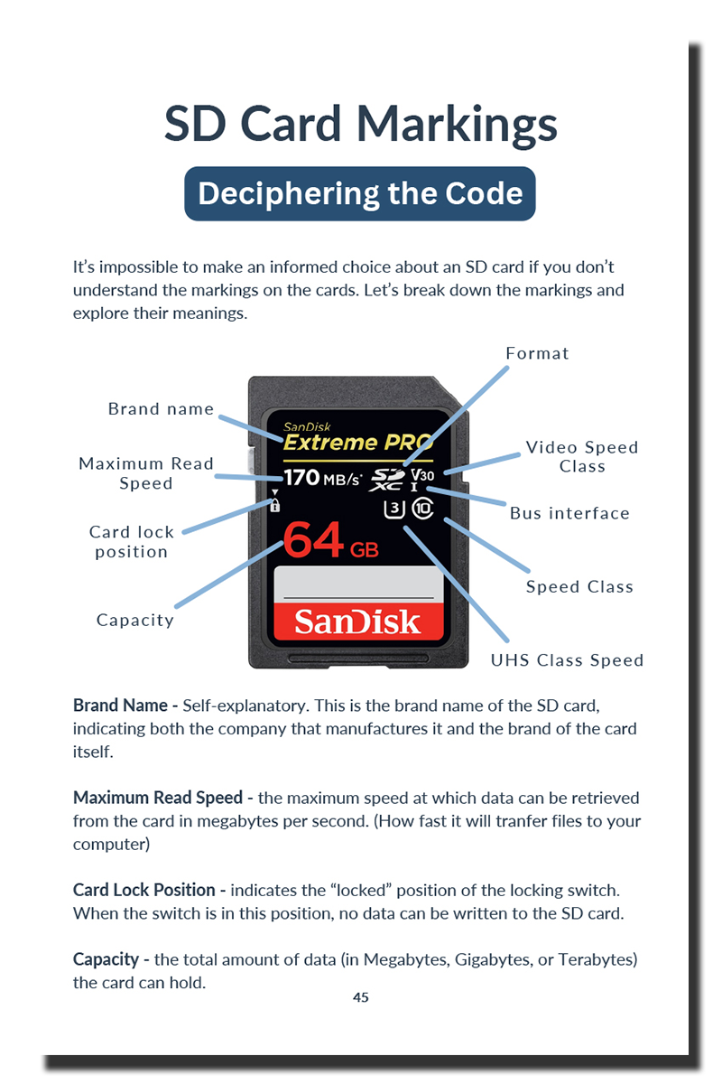 Never be confused about SD cards again. The ebook contains a section explaining the meanings of the markings on SD cards. You will finally understand what it all means, and can stop wasting money on incompatible cards that don’t work in your camera.